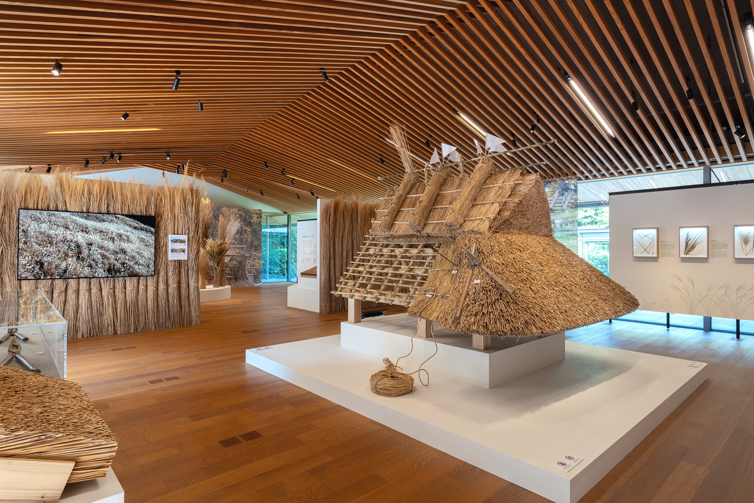 神戸会場では、常設展示との連動により展示品がさらに増え、理解しやすく、体験しやすい内容になっています。ふだん目にすることのない植物で葺かれる屋根の仕組みを、目の高さで観察できるまたとない機会です。