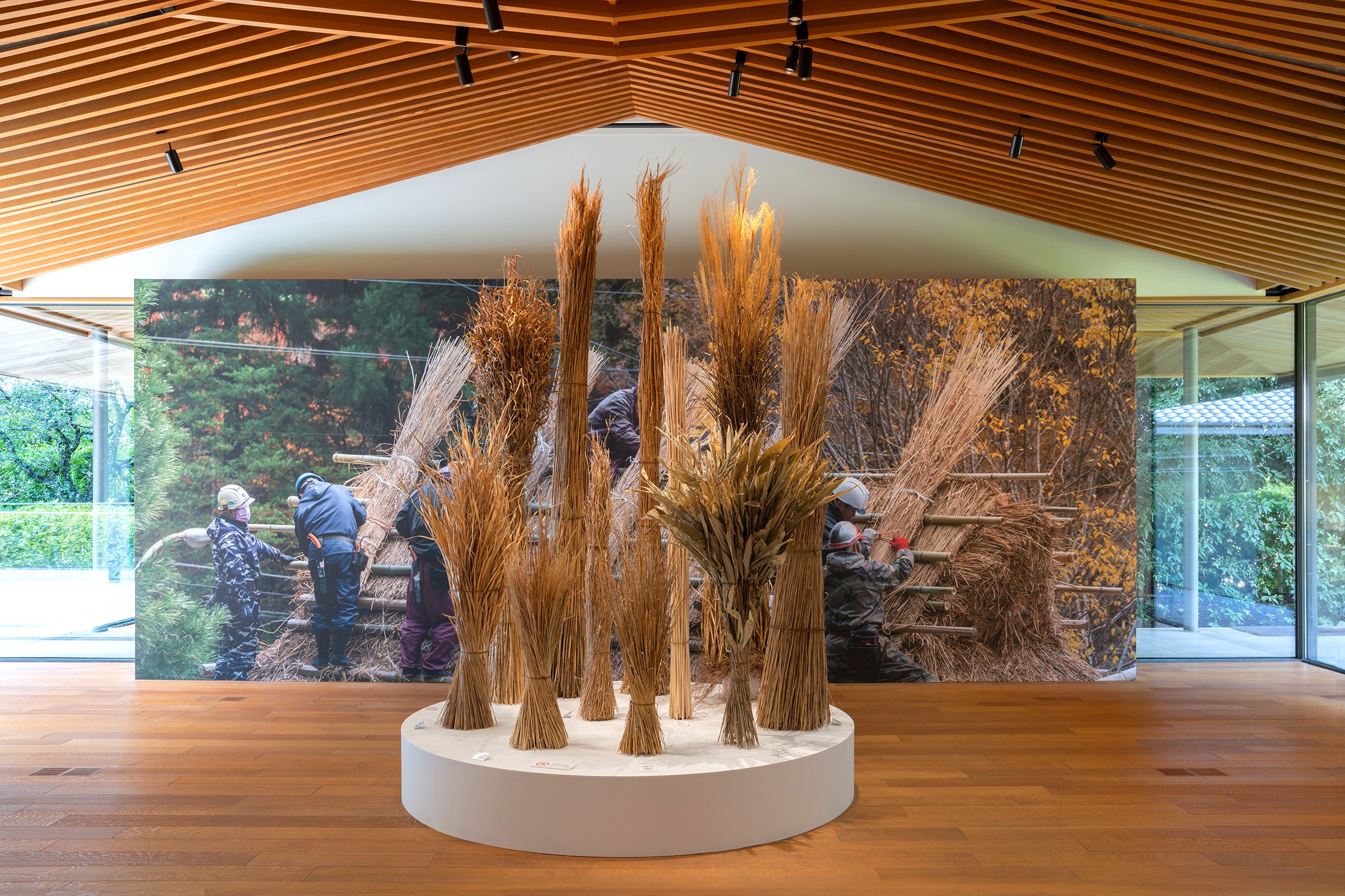 大型の茅葺き屋根構造模型と4K映像2作品をご覧いただけます。東京と同様に高知県梼原町から4名の屋根葺き職人が来場し、4日間かけて会場で実際に茅を葺き上げました。最終日にはオープン記念イベントとして、その作業を来館者の皆さんに公開しました。