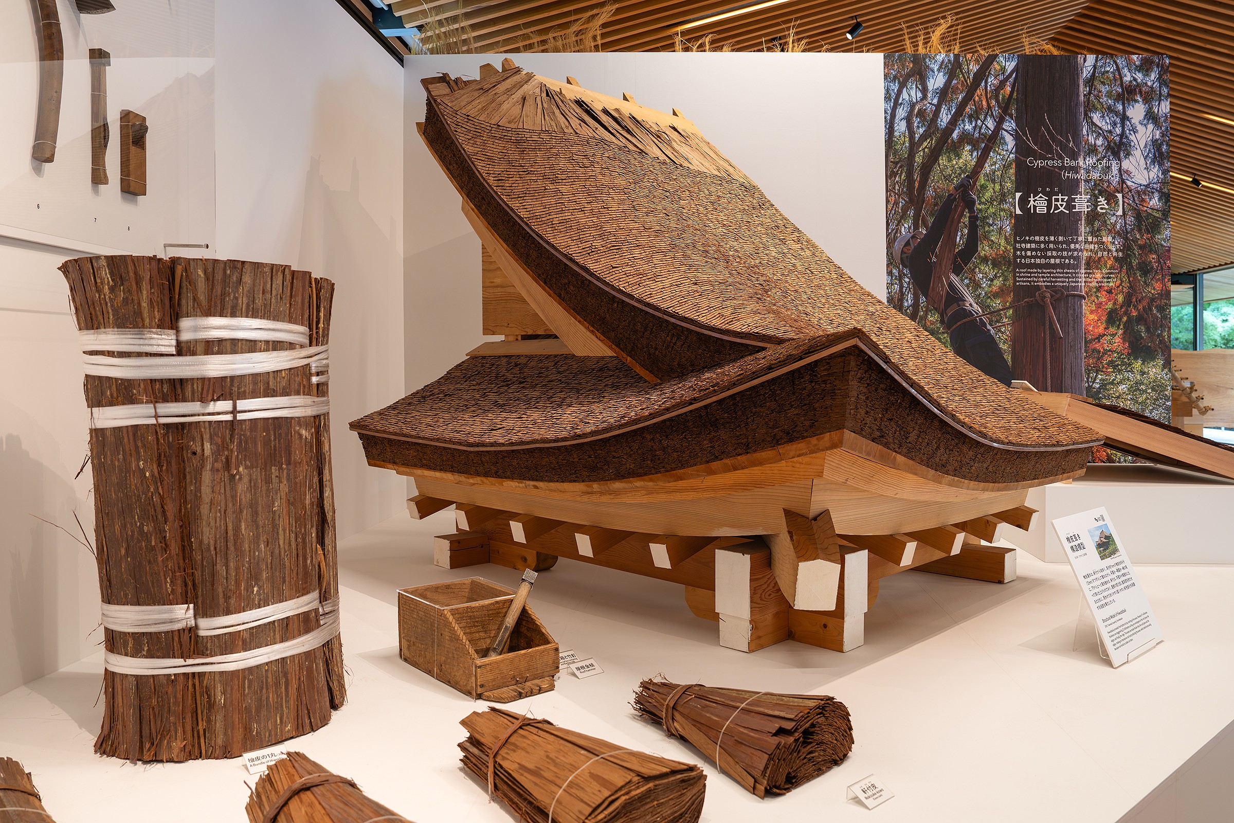 檜皮葺きの構造模型・材料・道具を展示。それらの使い方をまとめた映像もあります。
