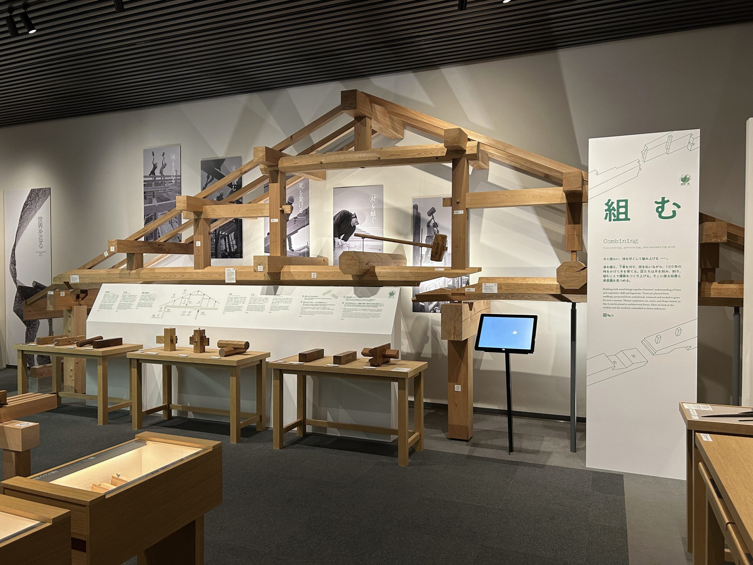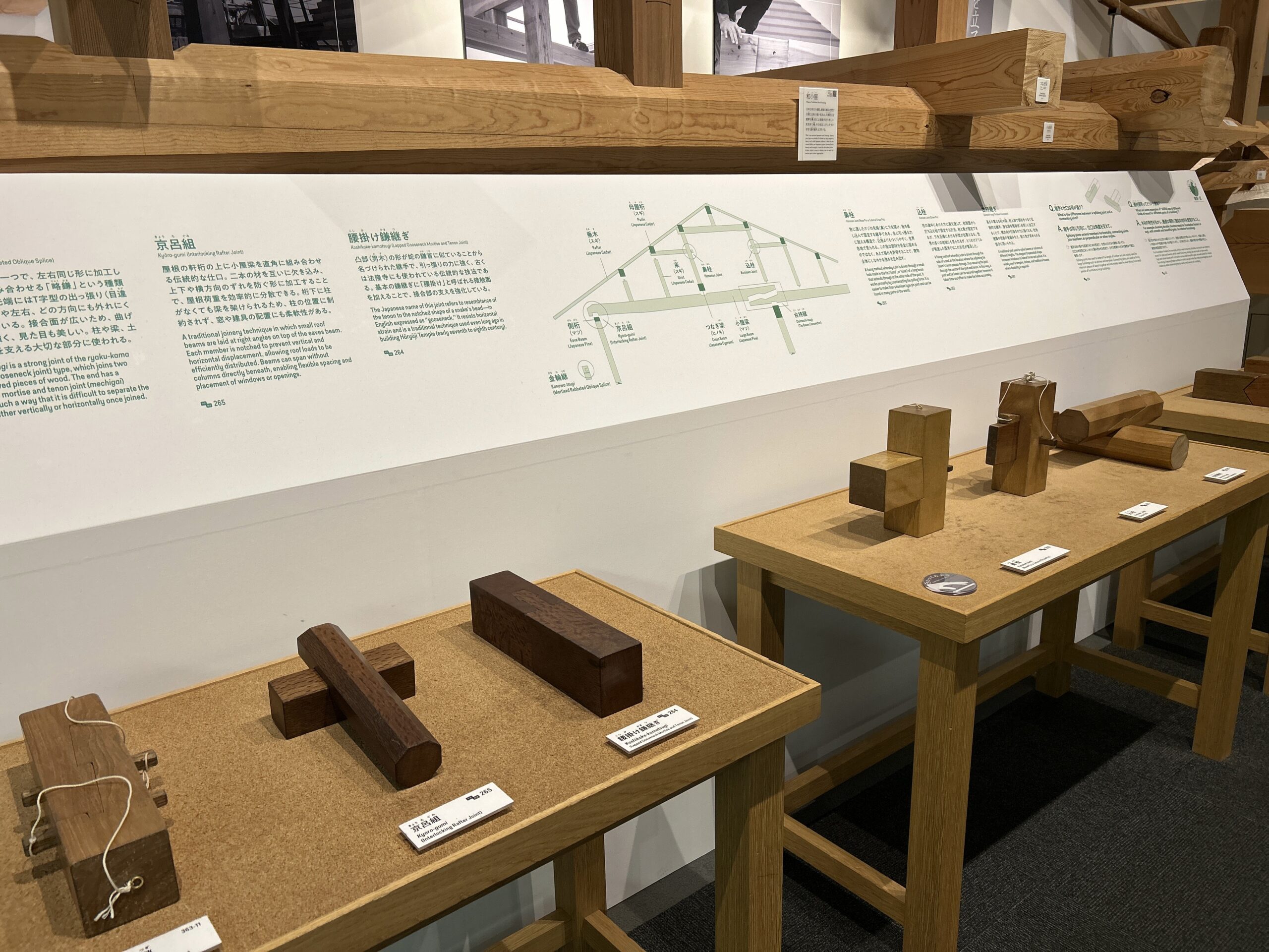 常設展示「木組みの家」と連動。さまざまな継手(腰掛け鎌継ぎ・金輪継ぎなど)が実際にどこで使われているか確認できます。また、継手を手に取って組み合わせて体験することもできます。