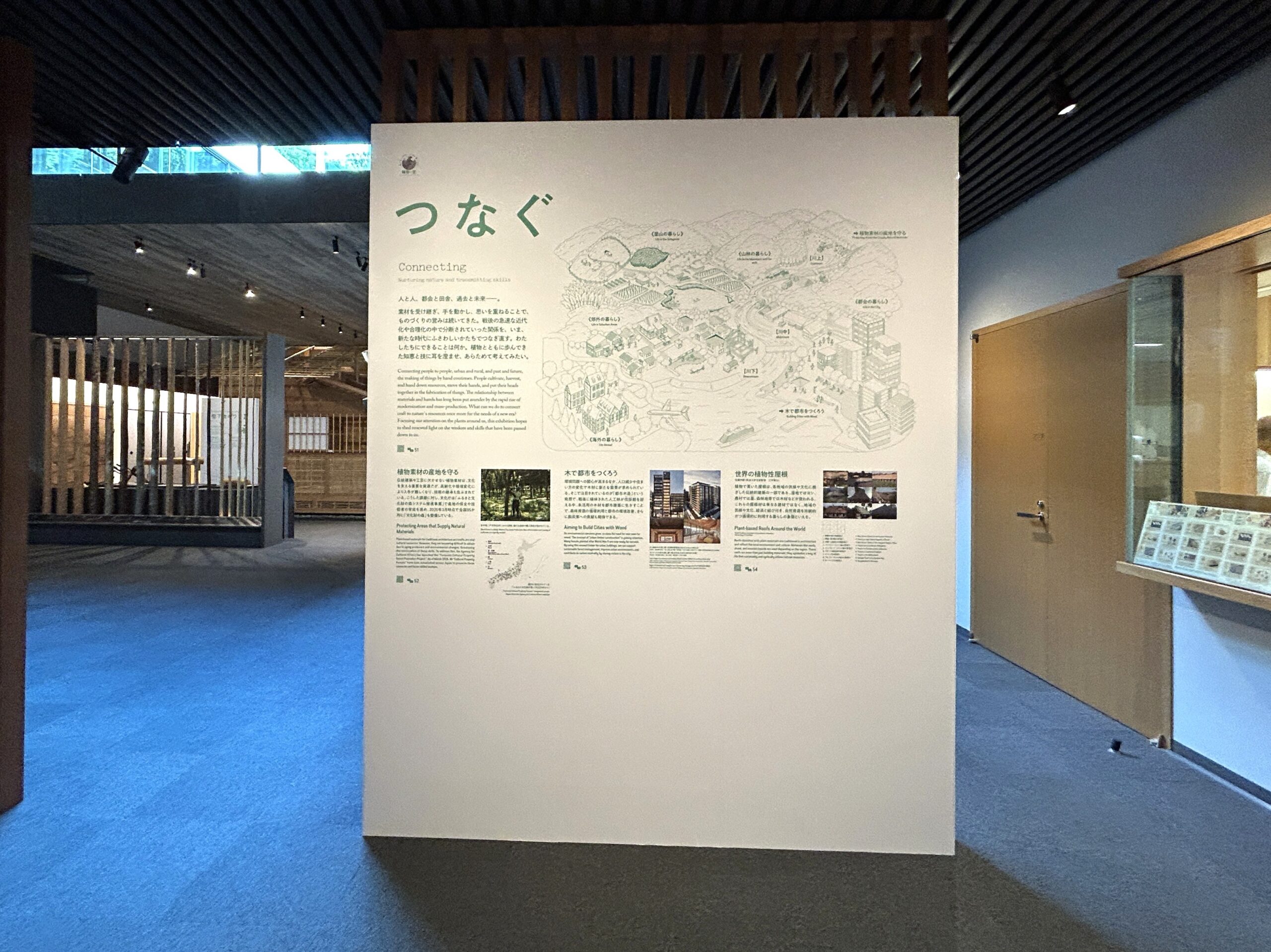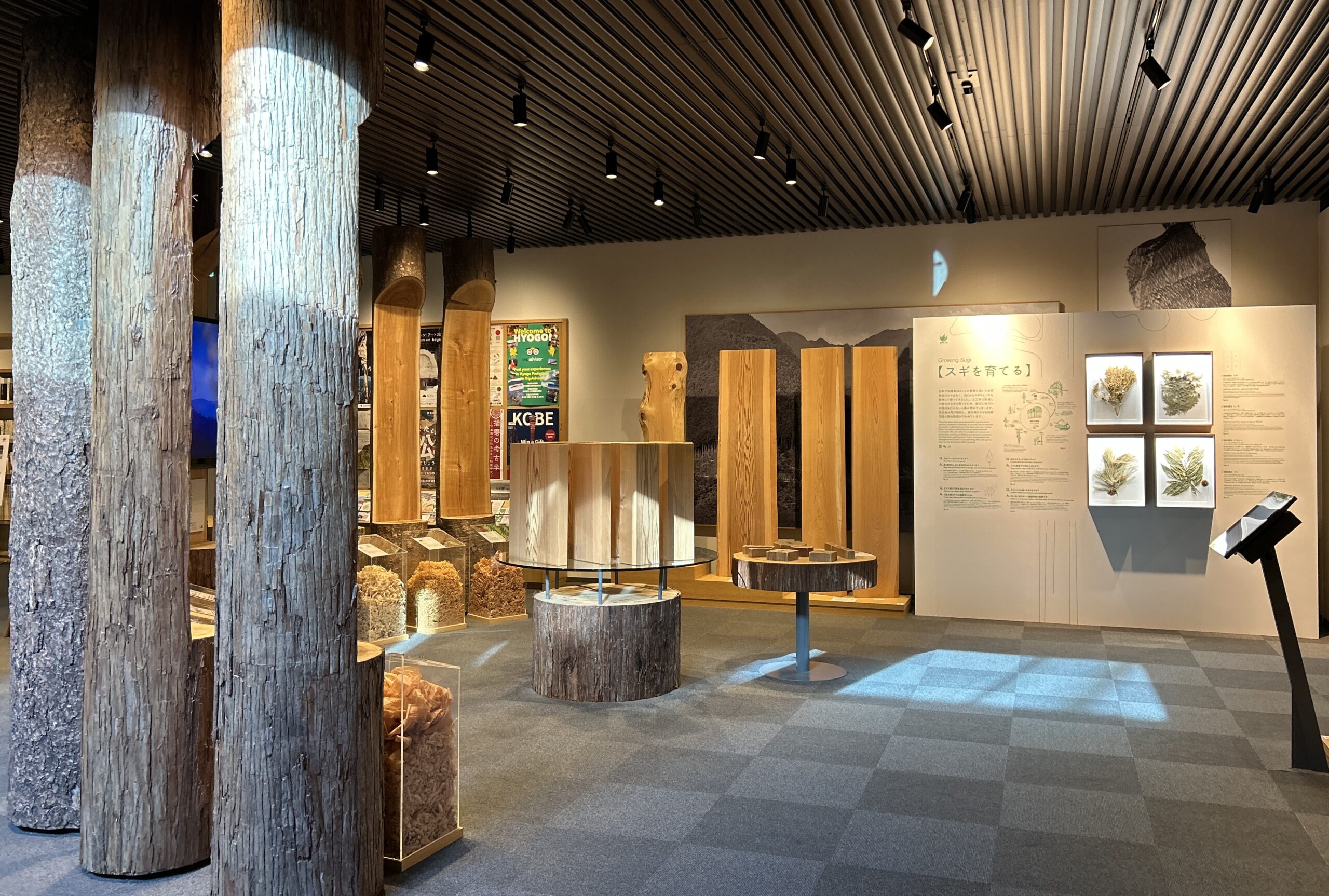 建築に使われる木材とその鉋屑(かんなくず) の展示では香りも確かめることができます。東京展示の4種(スギ、ヒノキ、アカマツ、クリ)に加え、神戸ではヒバ、ツガ、ケヤキ、サクラを展示し、種類がさらに豊富になっています。